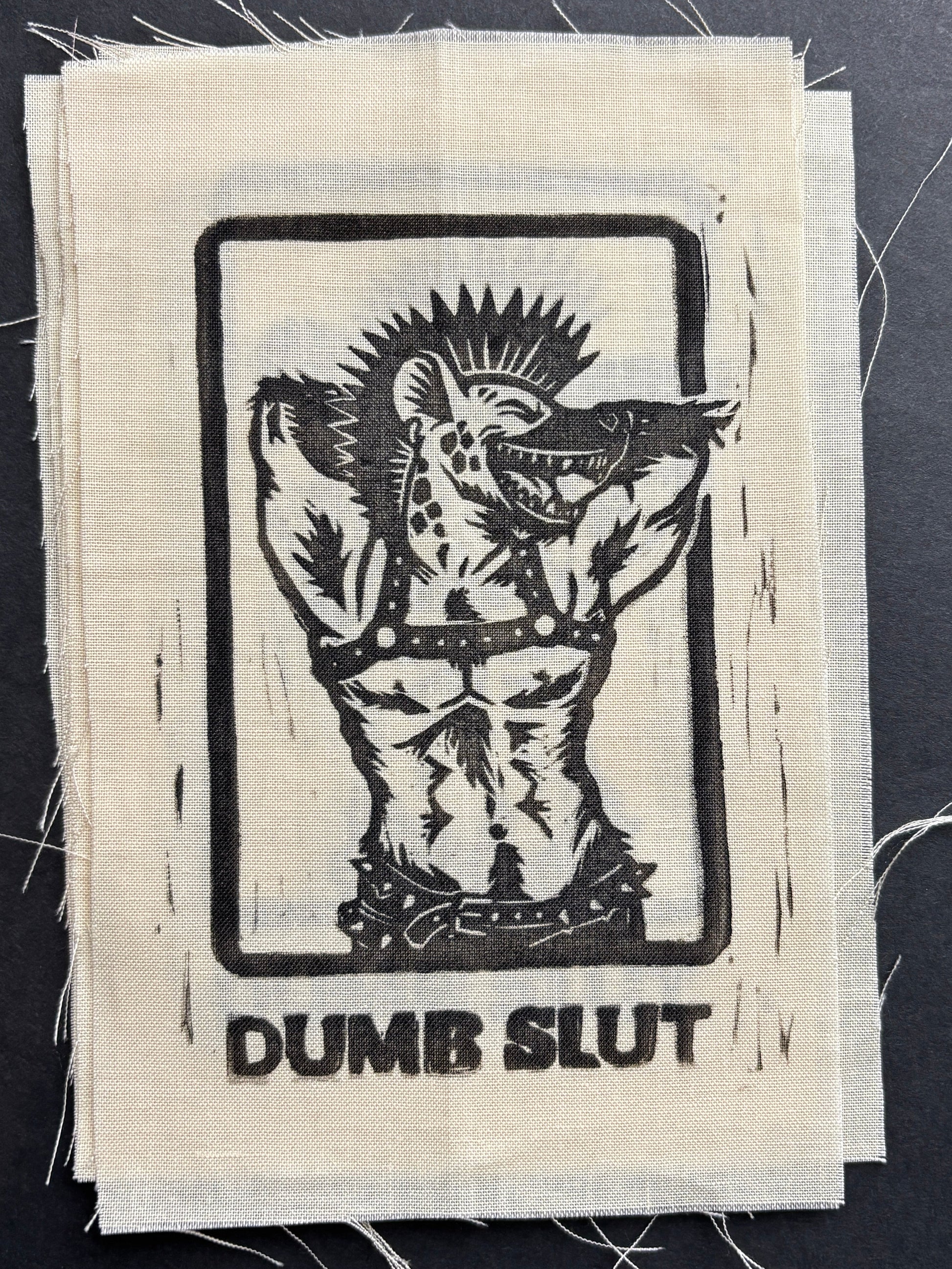 This listing is for one A/B-grade quality hand-stamped patch of my "Dumb Slut" design. You will not get this exact patch pictured, but will get the exact design.