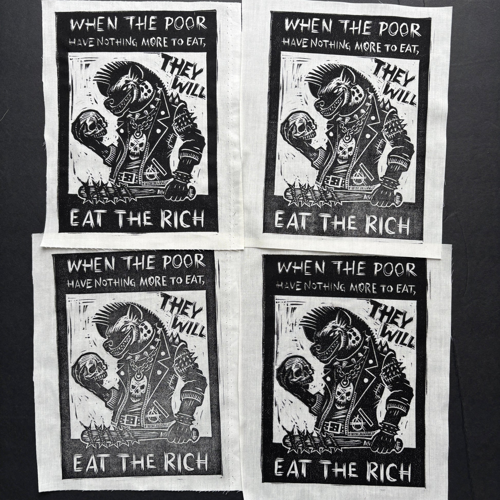 This listing is for one MISPRINT quality (B-grade or lower) hand-stamped patch of my "Eat The Rich" design. You will not get the exact patch pictured, but will get the exact design.