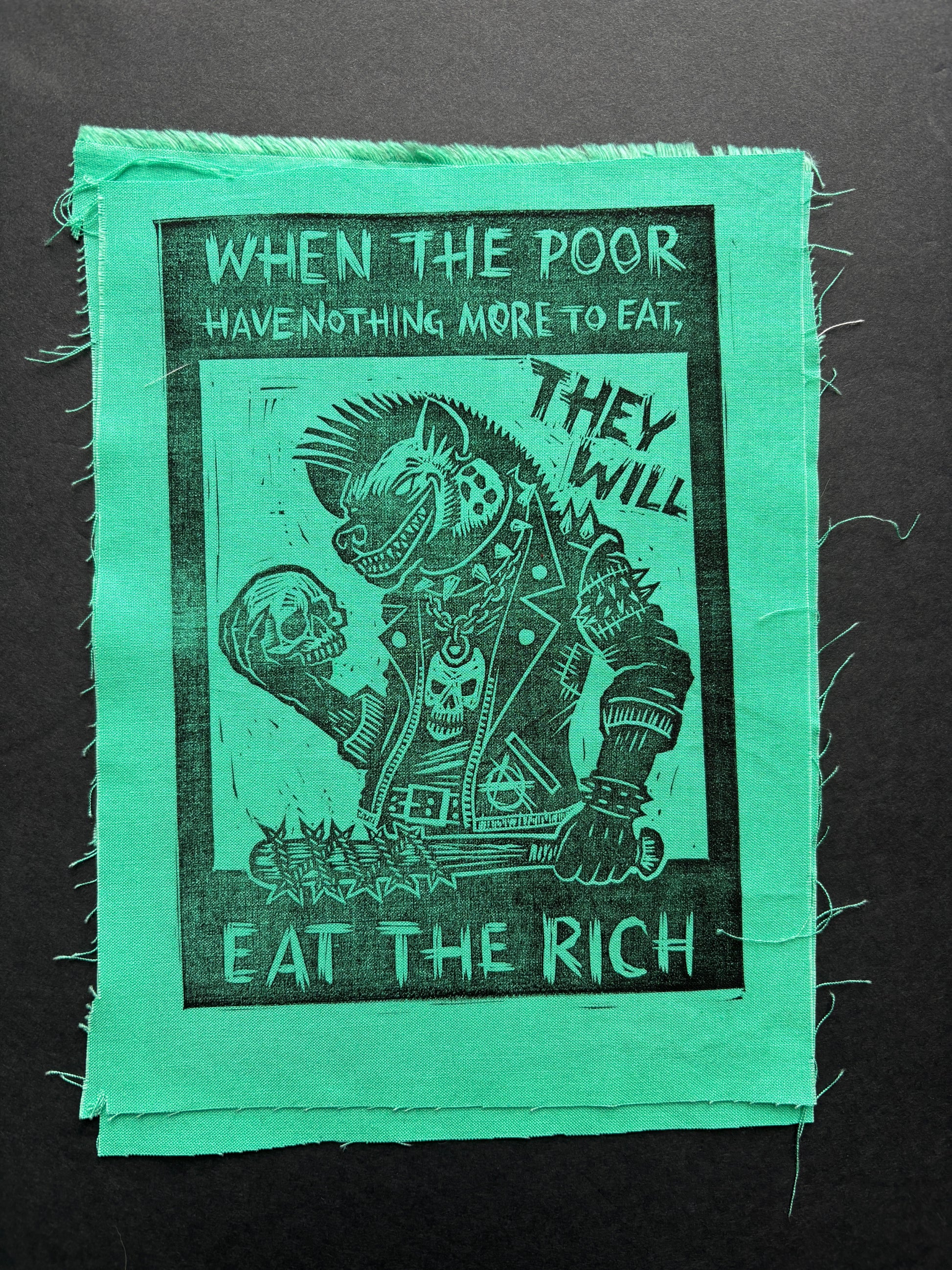 This listing is for one MISPRINT quality (B-grade or lower) hand-stamped patch of my "Eat The Rich" design. You will not get the exact patch pictured, but will get the exact design.