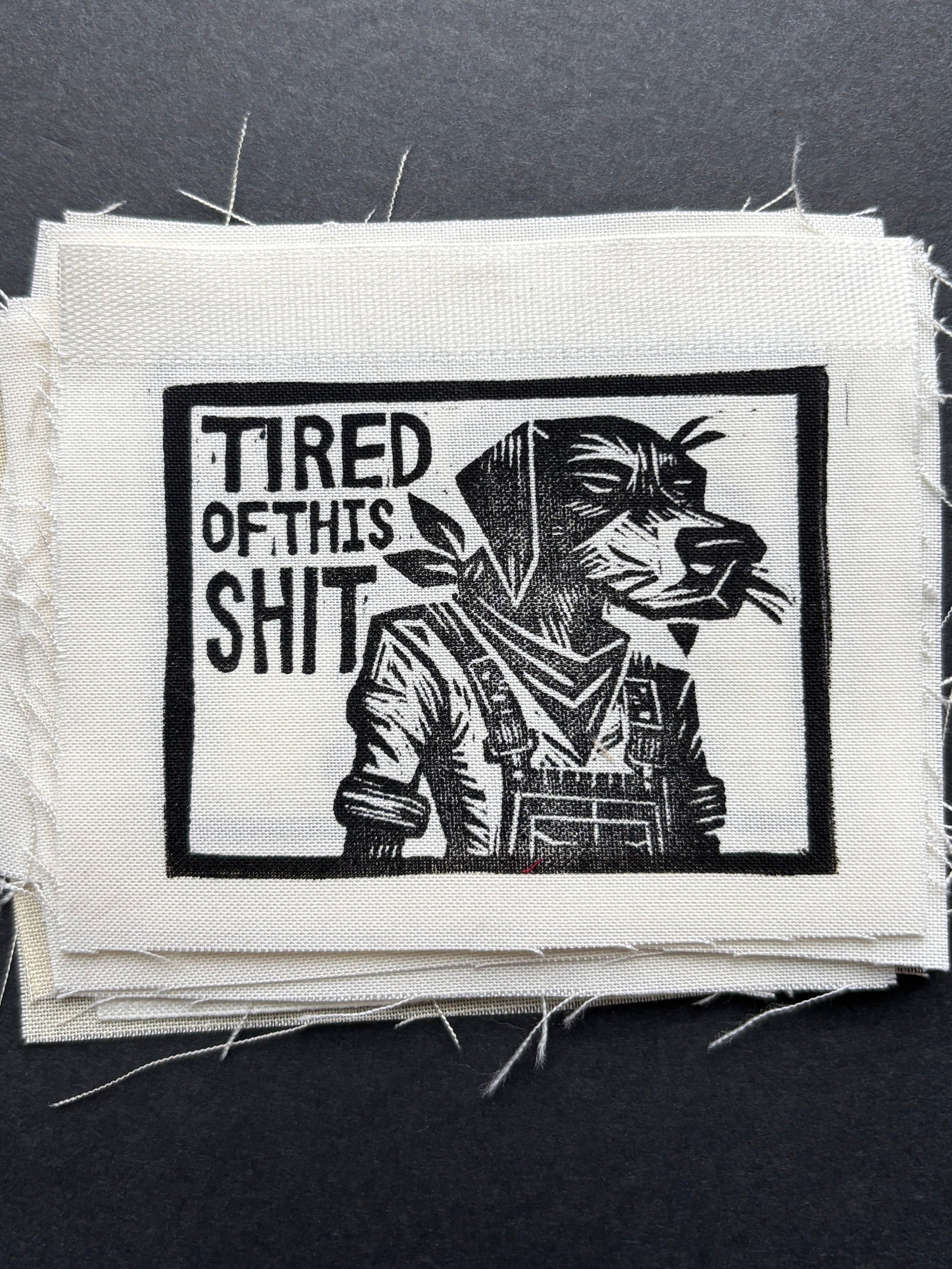 This listing is for one A/B-grade quality hand-stamped patch of my "Tired Of This Shit" design. You will not get this exact patch pictured, but will get the exact design.